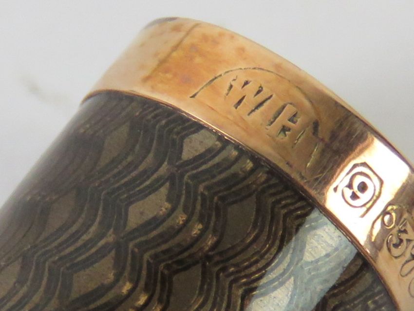 A superb 9ct rose gold and guilloche enamelled cigarette holder / cheroot having amber mouthpiece in original fitted leatherette case, hallmarked for Birmingham 1919.