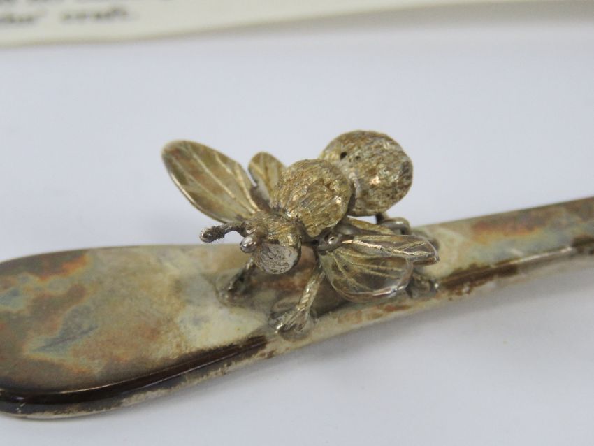 Amanda Birkett FSD-C (b1957); a HM silver sifter spoon having applied bee upon, hallmarked London 1994, 1.51ozt.