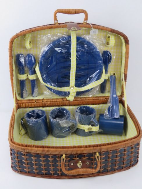 A wicker picnic basket with contents.