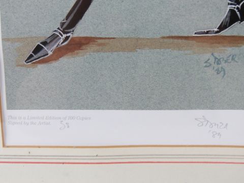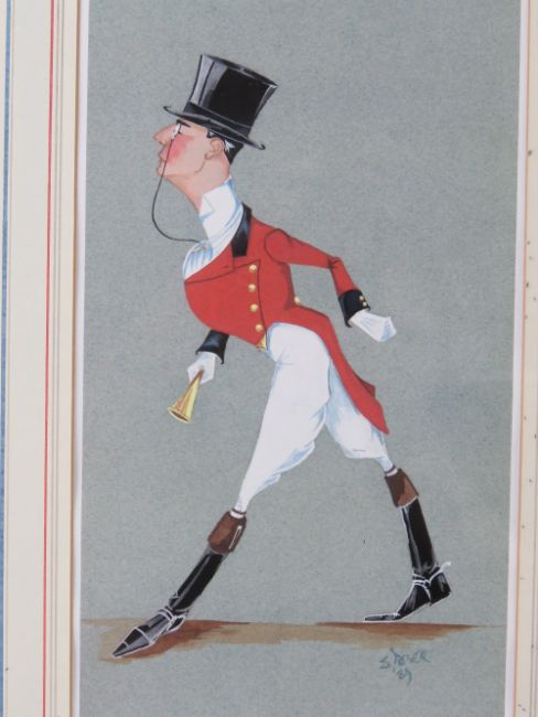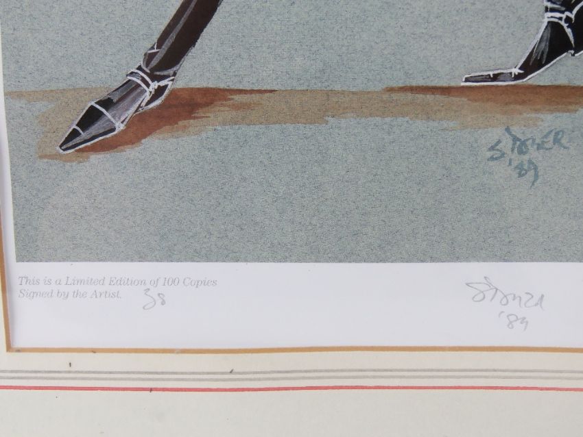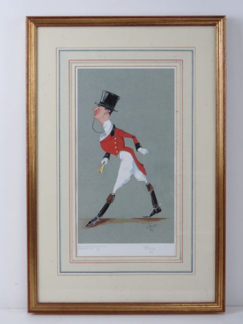 A limited edition print of a Vanity Fair type huntsman, Stoker(?) 1989, No 38 of 100 signed by the artist, 34 x 18cm.
