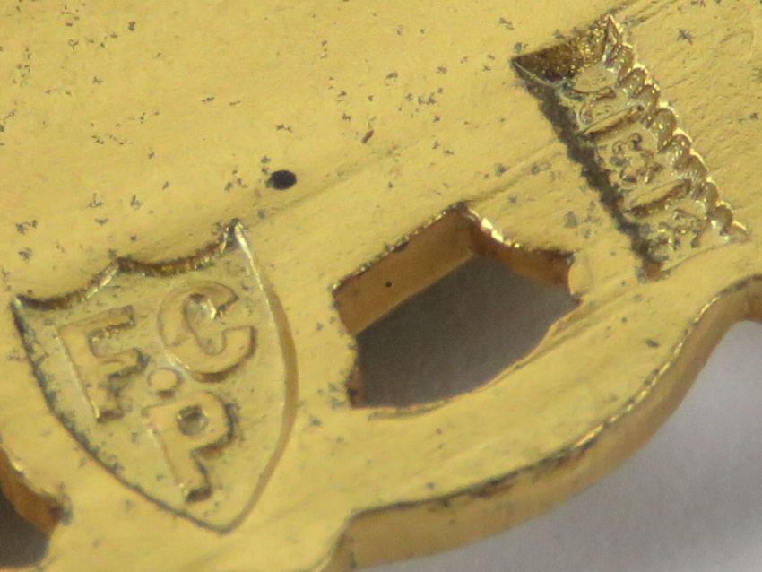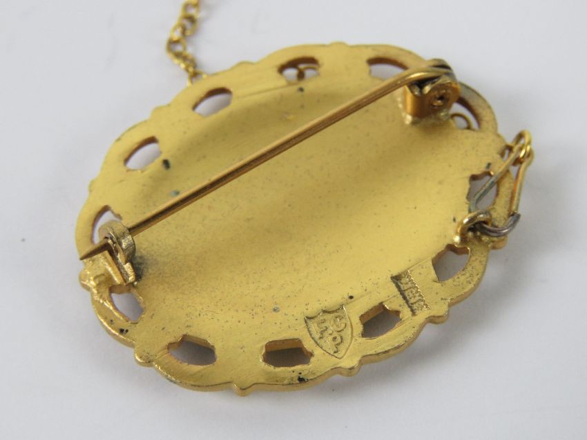 The Royal Antediluvian Order of Buffaloes (RAOB); a HM silver and enamel brooch having buffalo upon, gilded, hallmarked for Birmingham with FC Parry makers mark, complete with safety chain, 3.5cm wide.