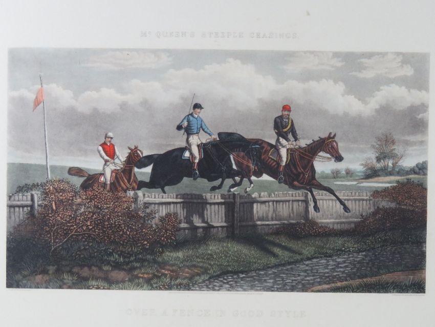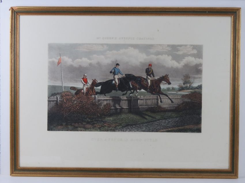 Print; McQueen's Steeplechasings over a fence in good style published 1876, hand tinted, framed and glazed, 60 x 83cm.