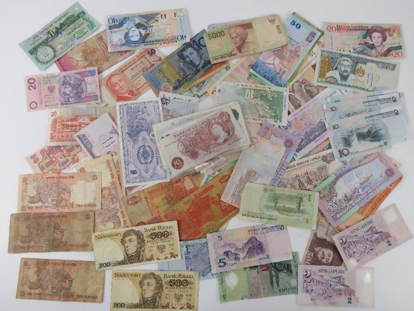 A large quantity of assorted bank notes including notes from India, Philippines, Australia, Zambia, Guernsey, Poland, Portugal, Eastern Caribbean, Peru, Maldives, UK, USA, etc.