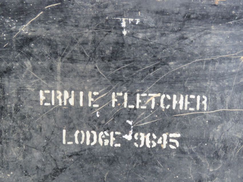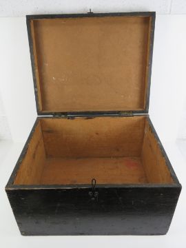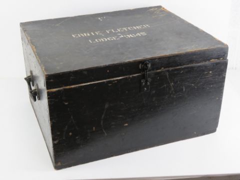 The Royal Antediluvian Order of Buffaloes (RAOB); A large wooden trunk from the Ernie Fletcher Lodge no 9645 having cast iron end handles and measuring 56 x 45 x 32cm. Provenance: From the collection of a member of various lodges since 1980s.