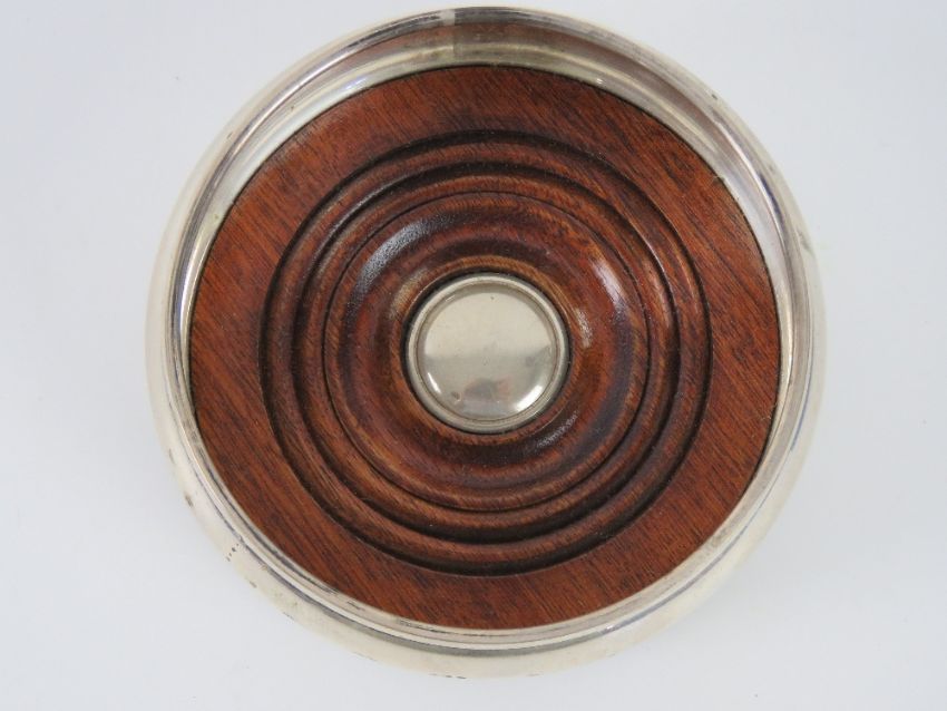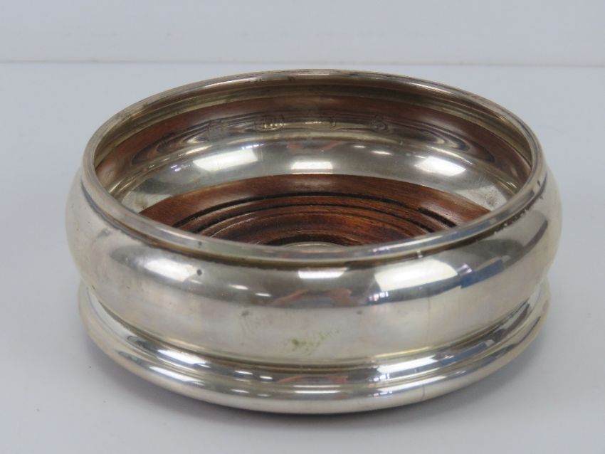 A HM silver wine coaster having green baize to turned wooden base, hallmarked for London, 10cm diameter.