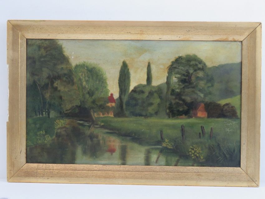 Oil on board, naive study of a riverside, house and trees beyond, monogrammed lower left 'JC', 26cm x 45cm.
