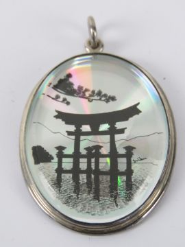 An unusual HM silver pendant having Japanese scene on silver background, hallmarked Sheffield, 5.2cm in length inc bale.
