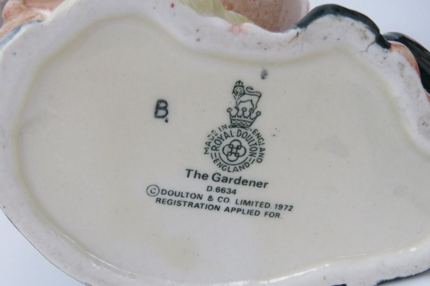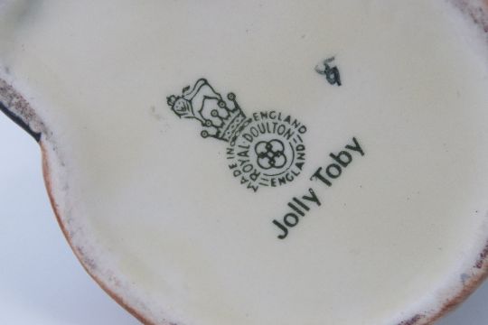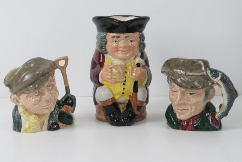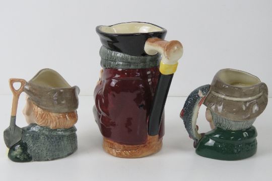 Two Royal Doulton Toby jugs being 'The Poacher' D6464 and 'The Gardener' D6634, each measuring 10cm high. Together with another Royal Doulton Toby jug 'Jolly Toby', 15.5cm high.