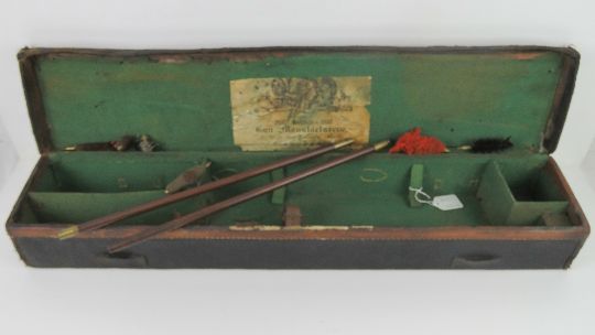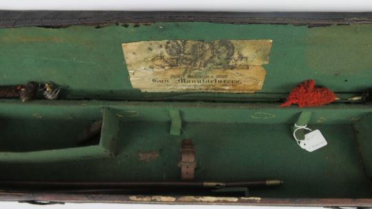 A part leather gun case bearing label for John Blanch & Son No 29 Gracechurch Street London, opening to reveal cleaning rods and brushes within, a/f, 81cm in length.