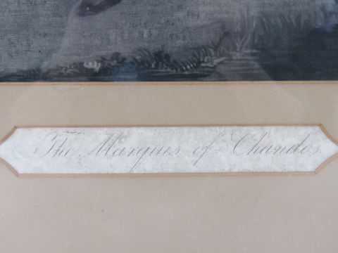 Engraving; an impressing monochromatic print from a painting by John Jackson entitled 'The Marquess of Chandos' (Richard Plantagenet Temple-Newgent-Brydges-Chandos-Grenville, Second Duke of Buckingham and Chandos KG GCH PC FSA. 11th Feb 1797 - 29th July 1861, Tory Politician, Lord Privy Seal, and owner of Stowe House, Buckingham) 61 x 40cm, mounted and within ebonised and reeded frame.