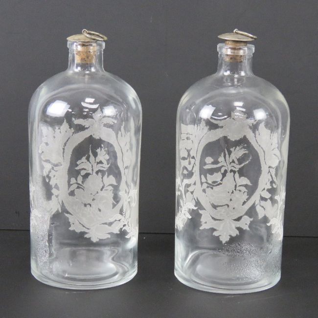 Two 'apothecary' style glass bottles having etched floral design to front, each with stopper, 21cm high.