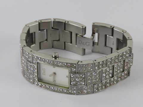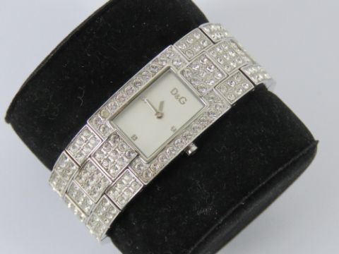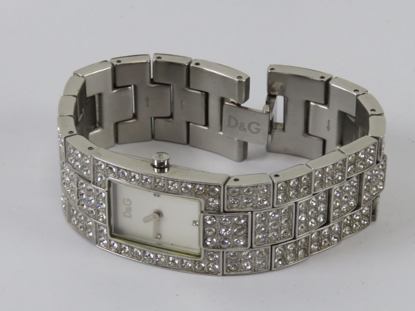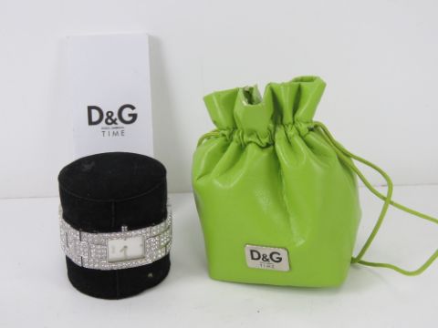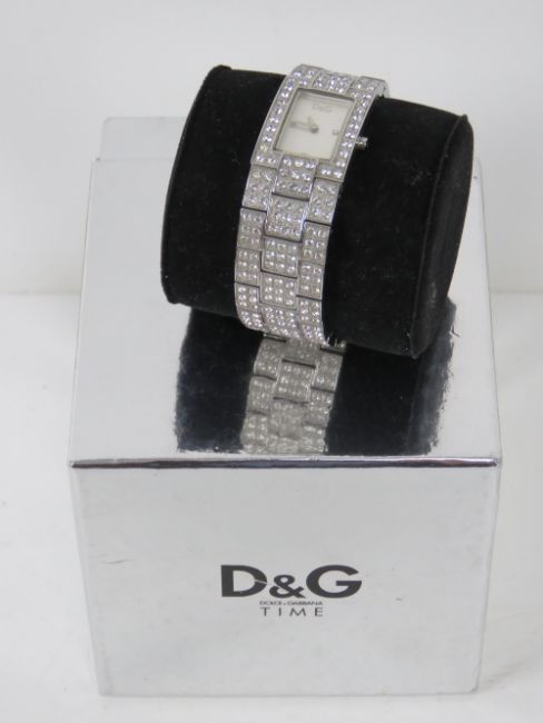 A D&G ladies wristwatch with box and papers, silvered dial, original integral strap encrusted with white stones.