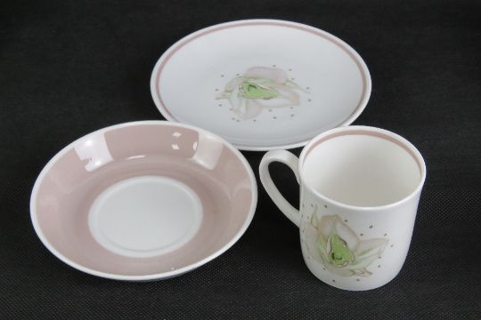 A set of five Susie Cooper trios each in Orchid design with white and blush pink ground, with additional matching coffee can and side plate.