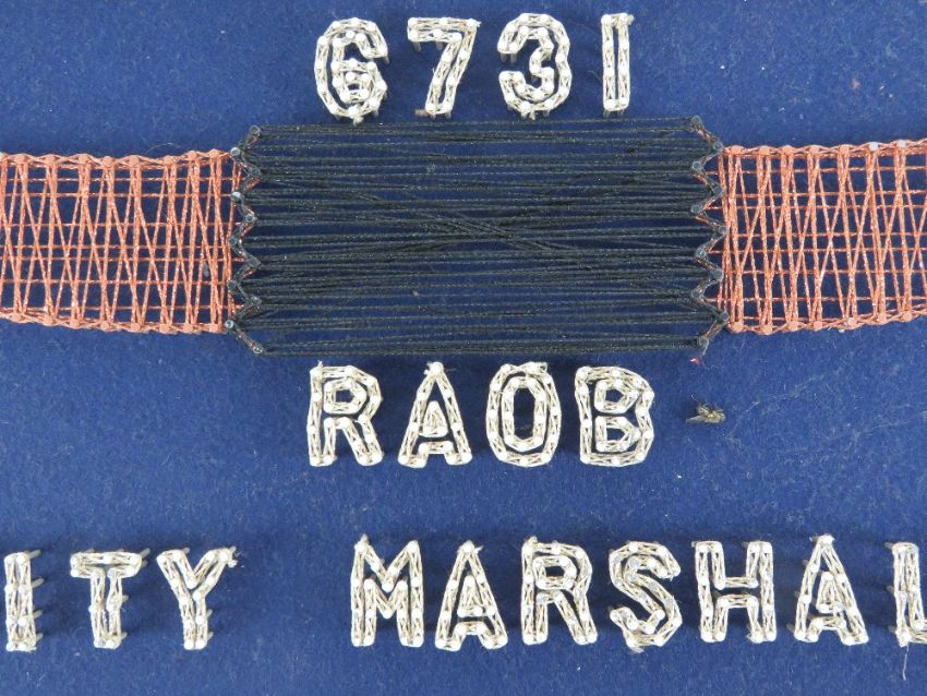 The Royal Antediluvian Order of Buffaloes (RAOB); A pair of handmade pin embroidered signs for Rupert Lodge No.6731 being Worthy Primo and City Marshall, each measuring 62 x 31.5cm.