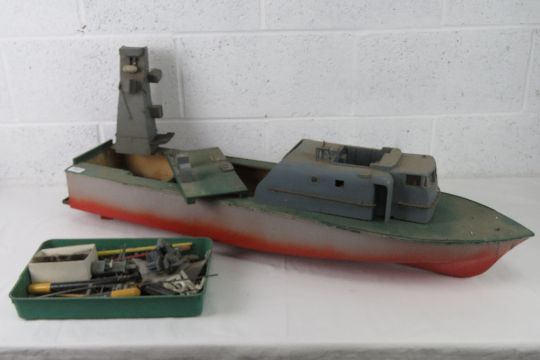 A scratch built scale model part finished vintage naval frigate of unknown class of wooden construction complete with quantity of various constituent parts for refitting, a/f. 110cm.
