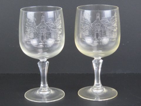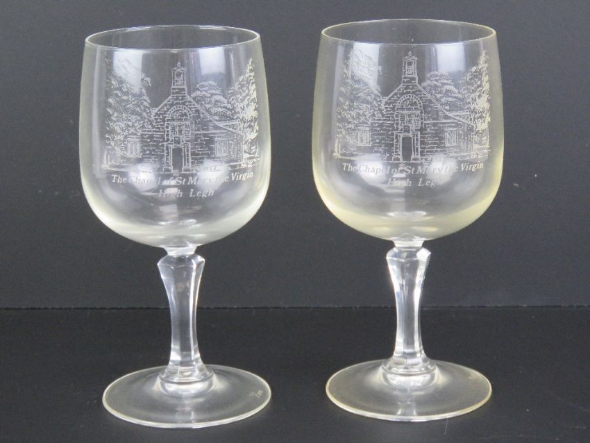 A pair of wine glasses having etched Chapel of St Mary the Virgin Highlegh upon, being Nos 7 and 8 of 250 and each standing 16cm high.