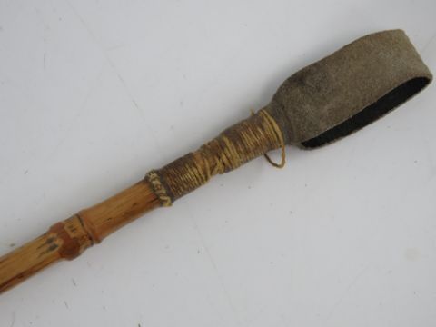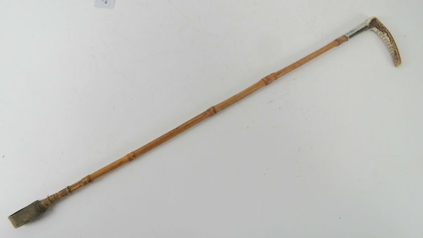 A ladies horn handled and HM silver collared bamboo riding crop with leather tail, 63cm in length.