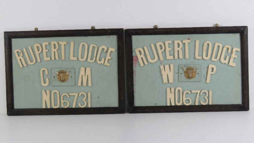The Royal Antediluvian Order of Buffaloes (RAOB); A pair of Rupert Lodge 6731 signs for the WP and the CN, each measuring 44.5 x 31cm. Provenance: From the collection of a member of various lodges since 1980s.
