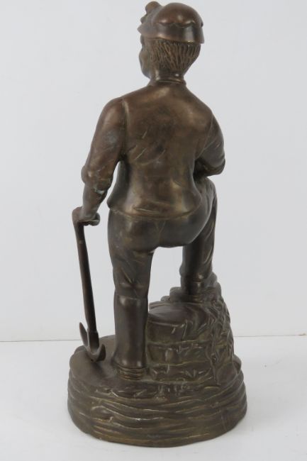 A heavy brass figurine of a miner in hat carrying lantern and pick axe, 31cm high.