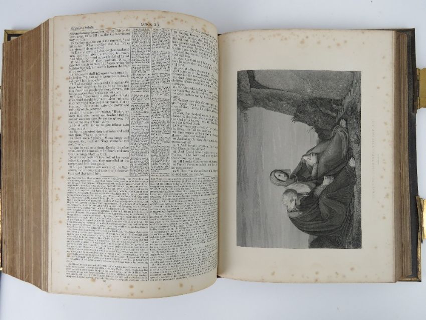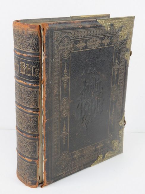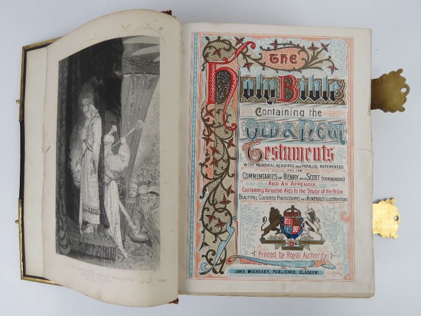 A leather bound illustrated family bible published by John McGready Glasgow, having gilt metal corner bracing and latches, front cover binding a/f, 34 x 26cm.