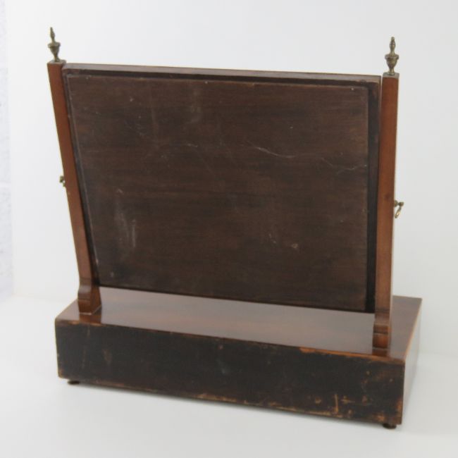 A good mahogany and walnut Georgian toilet mirror stung with box wood, central drawer flanked by twin box drawers, mirror suspended between twin reeded columns, 51 x 22 x 54cm.