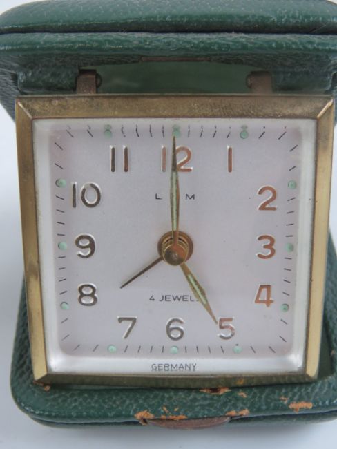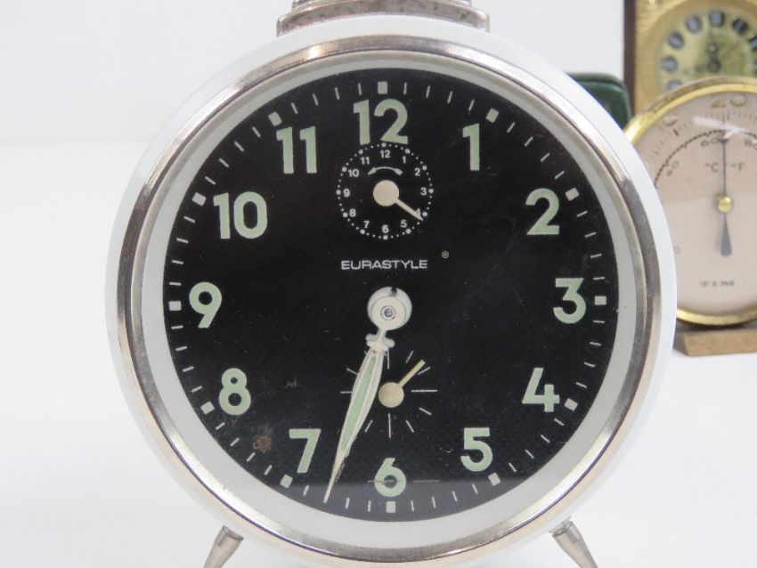 A quantity of assorted alarm clock, travel alarm clocks, miniature table clock and a table barometer. Four items