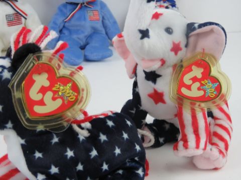 Ty Beanie Babies/Beanie Bears; American themed 'Righty' and 'Lefty' 2000 edition with tags, together with 'America' blue (x2 with tags), 'America' white with tag, 'Patriot' with tag, 'Glory' (no tag) and 'Red, White & Blue' ten year edition with tag. Eight items.