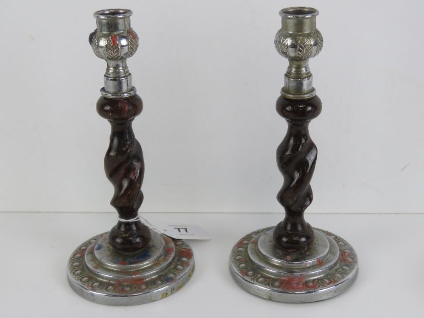 The Royal Antediluvian Order of Buffaloes (RAOB); a pair of silver plated and wooden barley twist alter candlesticks, each standing 21cm high. Together with four French glass candle holders. Provenance: From the collection of a member of various lodges since 1980s.