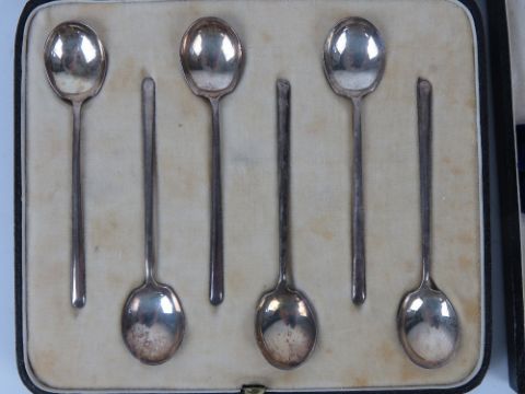 A set of six HM silver teaspoons in original fitted case, hallmarked Sheffield 1949. Silver weight 1.12oz. Together with a boxed set of EPNS spoons.