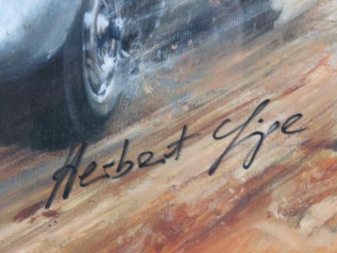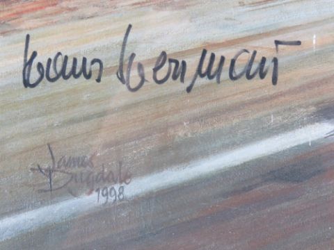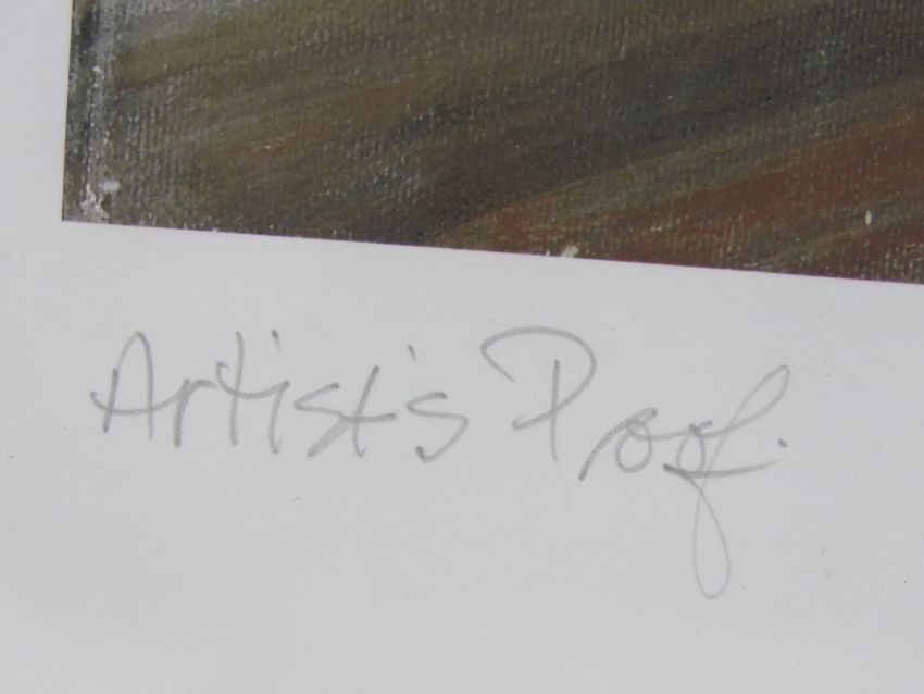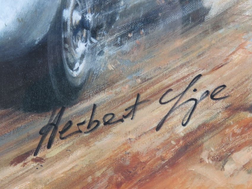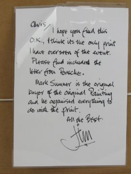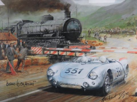Artists proof print 'Mille Miglia 1954' by James Dugdale. Hans Herrmann driving his Porsche 505 Spyder, speeding steam locomotive beyond. Signed lower right by the artist and bearing further signatures for Herrmann and Herbert Linge. With letter from Porsche Cars GB Ltd '...the prints of Mille Miglia 54 have now been returned from Germany and Porsche AG have kindly organised for the signatures of Hans Hermann and Herbert Linge to be added to them...'. 54 x 64cm. Framed and mounted.