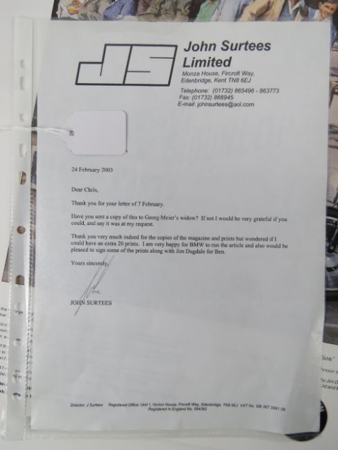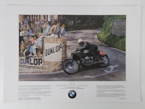 Colour prints; 'Inspiration' George Meier riding the BMW 255 Kompressor to victory in the 1939 Senior TT by James Dugdale 2003, six items. Together with a signed letter from John Surtees also dated 2003.