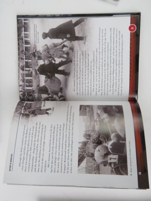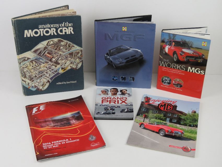 Books; 'The Works MGs' by Haynes, 'MGF' by Haynes, 'Anatomy of the Motor Car', 'History of Grand Prix', and two magazines. Six items.