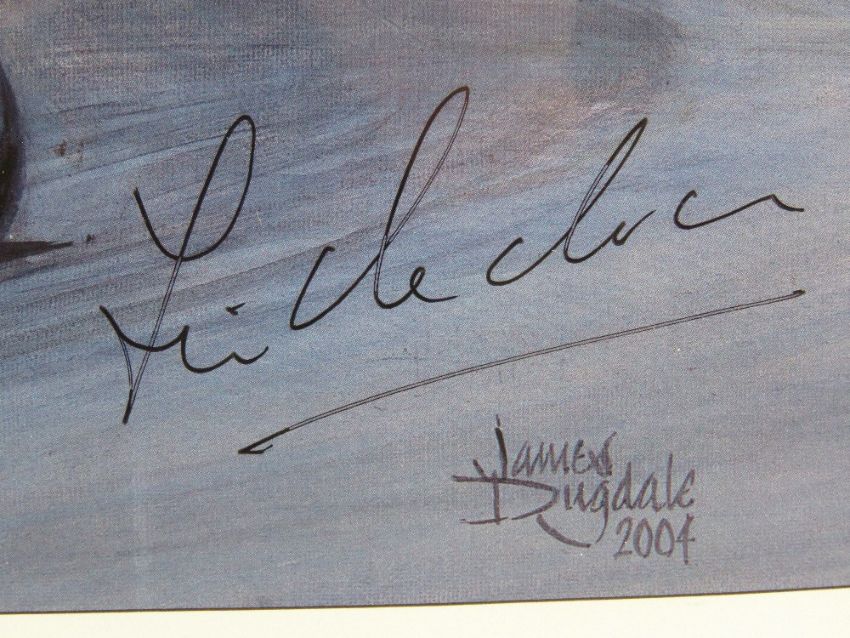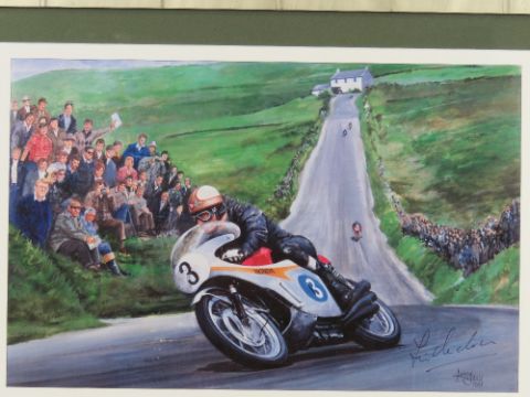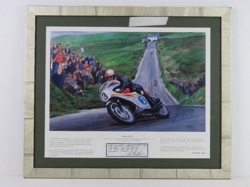 Print 'Simply the Best' Mike Hailwood at Creg-ny-baa, Isle of Man on his 297cc Honda breaking the outright circuit record on his way to victory in the 1967 TT, signed Jim Redman lower right, 40 x 49cm. Framed and mounted.