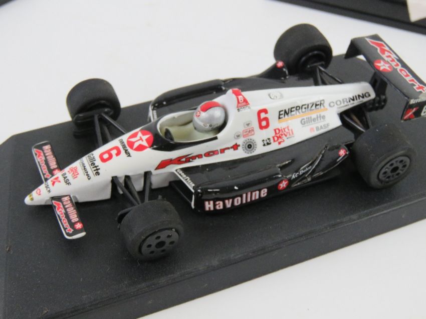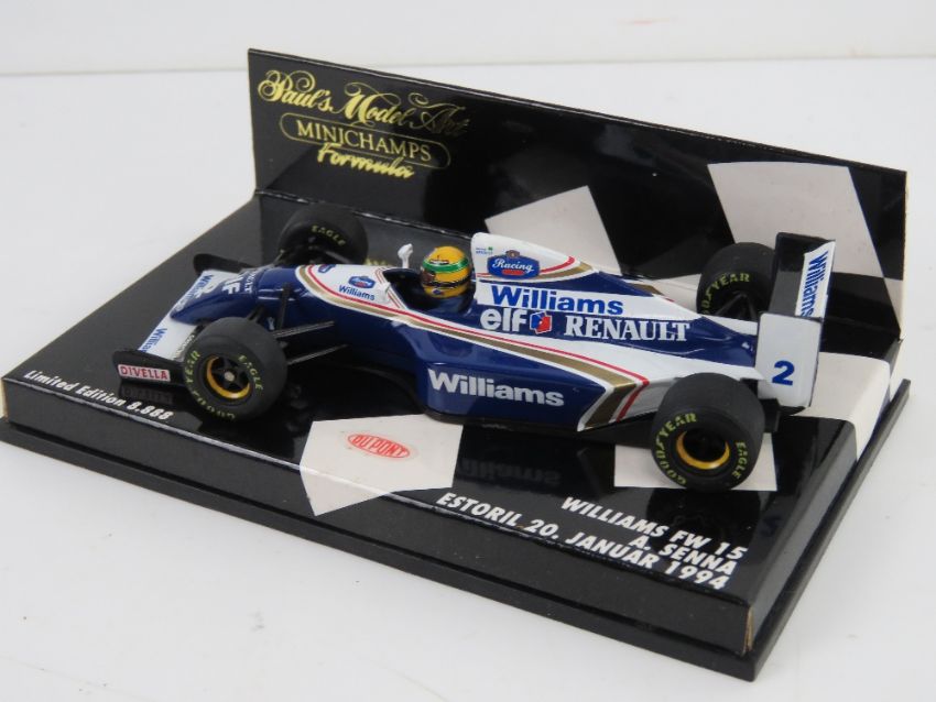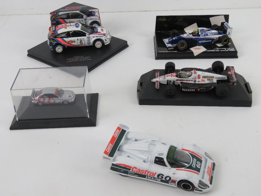 A quantity of model cars including 1:43 scale Ford Focus WRC (Colin McRae) 416 of 5000, Williams FW15 (Ayrton Senna), Jaguar XJR9, racing Audi, and another racing car. Five items.