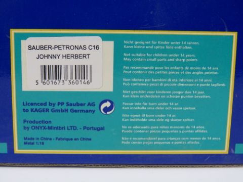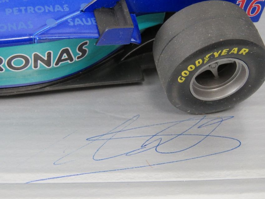 A 1997 Red Bull Sauber Petronas scale model racing car in box. Box signed by Johnny Herbert at the Autosport International Show 1998.