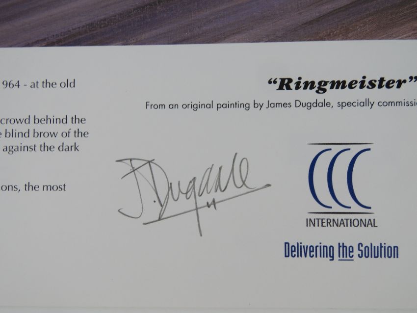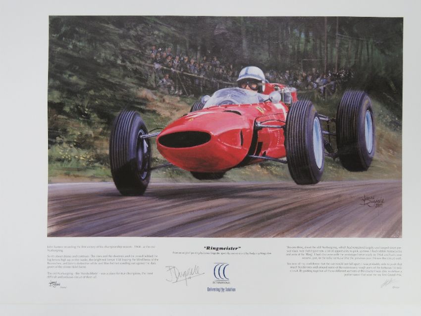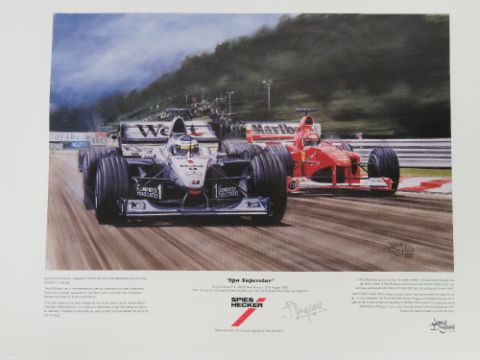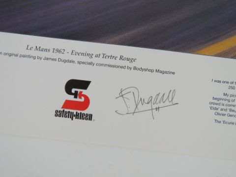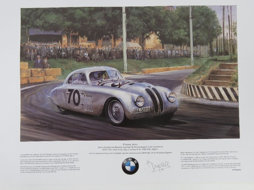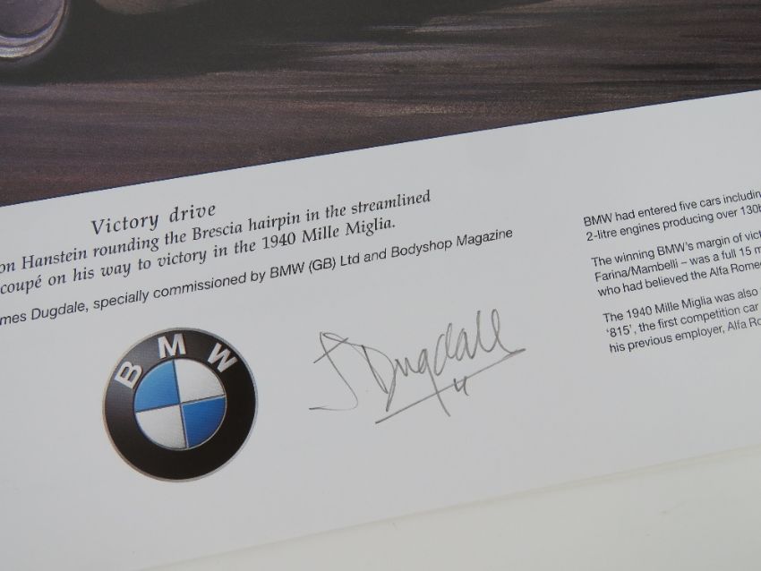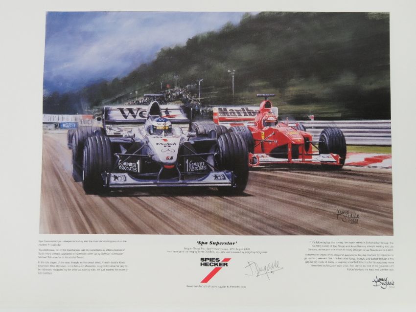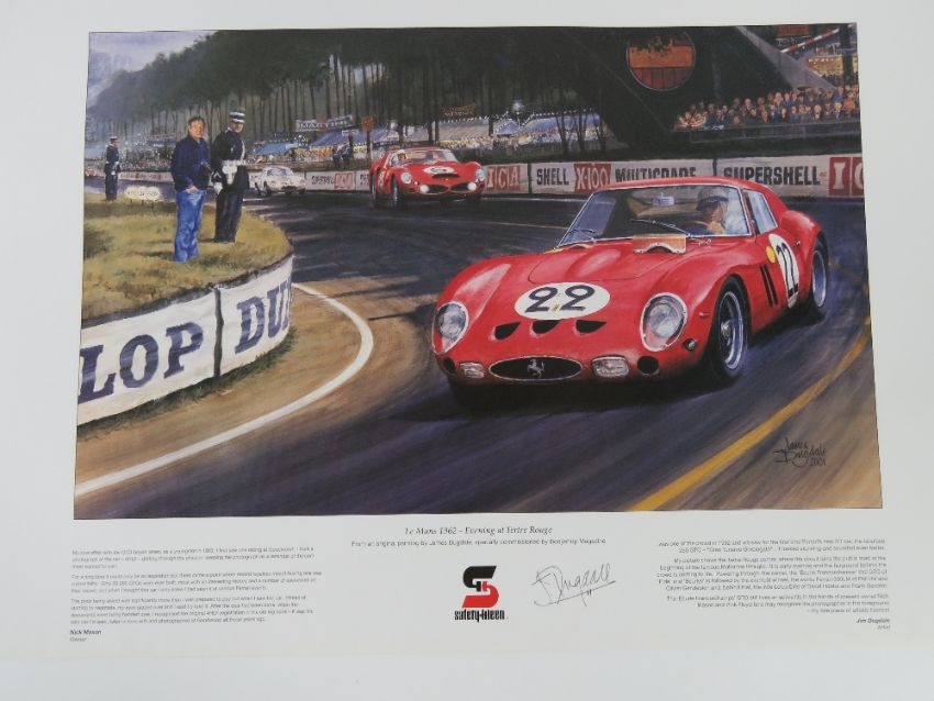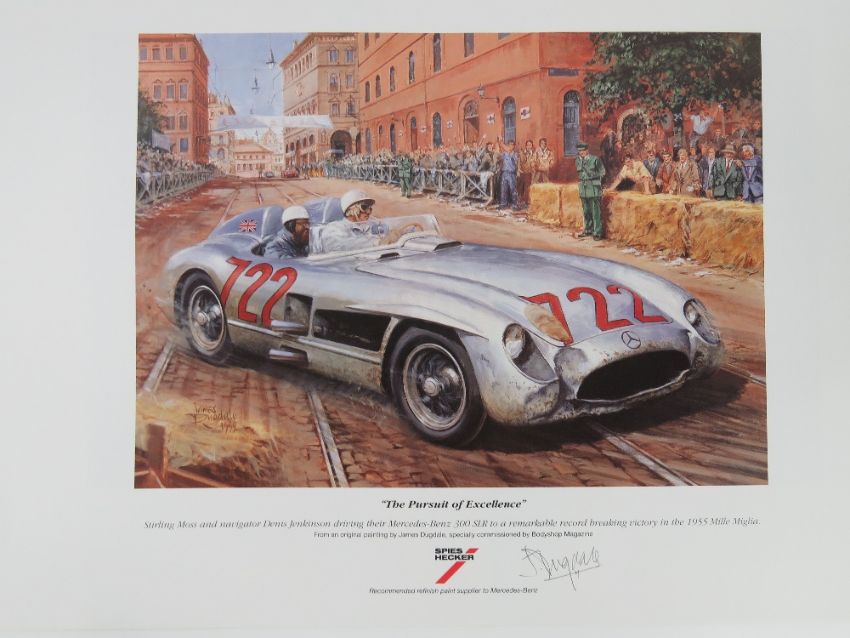 Six assorted James Dugdale colour prints each signed by the artist and measuring 47 x 29cm being; 'Victory Drive' Hanstein 1940 Mille Miglia BMW 328 Coupe, 'The Titans' Caracciola 1937 Nurburgring Mercedes-Benz W125, 'Spa Superstar' Mika Hakkinen 200 Belgian GP McLaren, 'Ringmeister' John Surtees 2004 German GP Ferrari 158, 'The Pursuit of Excellence' Moss/Jenkinson 1955 Mille Miglia Mercedes Benz 300SL, and 'Evening at Tert Re Rouge' Ferrari 250 GTO (Now owned by Nick Mason) Le Mans 1962.