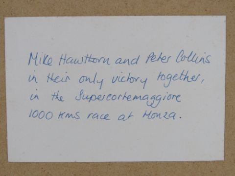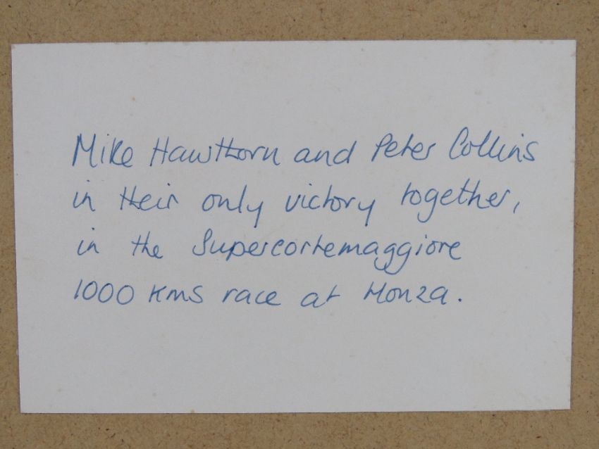 Watercolour study of Mike Hawthorn and Peter Collins in their only victory together in the Supercortemaggiore 100kms race at Monza, 40 x 28cm. Framed and mounted.