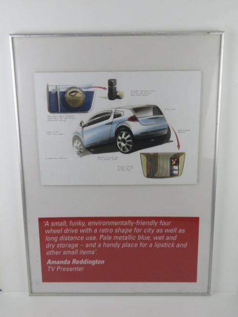 From the famous BEN (Motor and Allied Trades Benevolent Fund) auction at Brooklands Museum on February 17th 2001 where celebrities to create artwork depicting their dream cars. Amanda Reddington (Lot 5 in the BEN auction) 'A small funky environmentally four wheel drive with a retro shape for city as well as long distance use, pale metallic blue, wet and dry storage and a handy place for lipstick and other items', 30 x 42cm. Signed by Amanda Reddington, TV Presenter. Frames size 72 x 52cm.