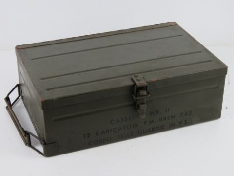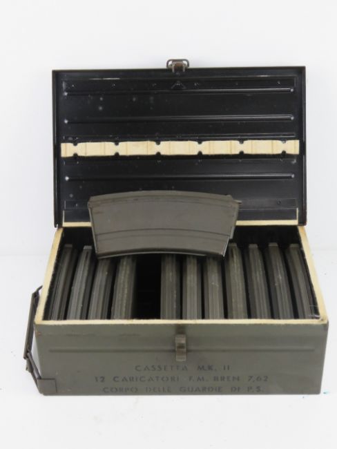 A rare .3006 Italian Bren Mk II 30rd magazine box and twelve magazines, with original stencilling on the box.