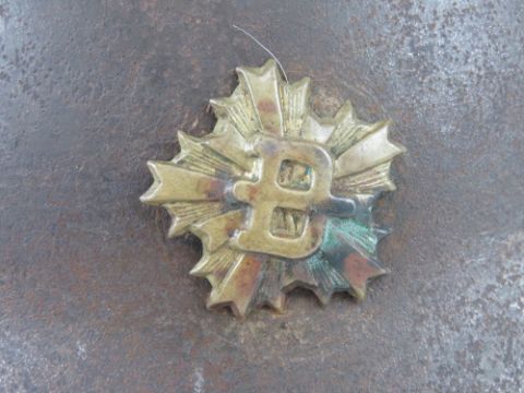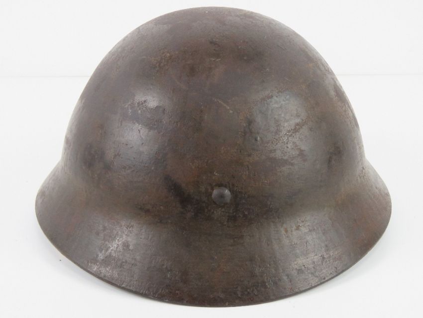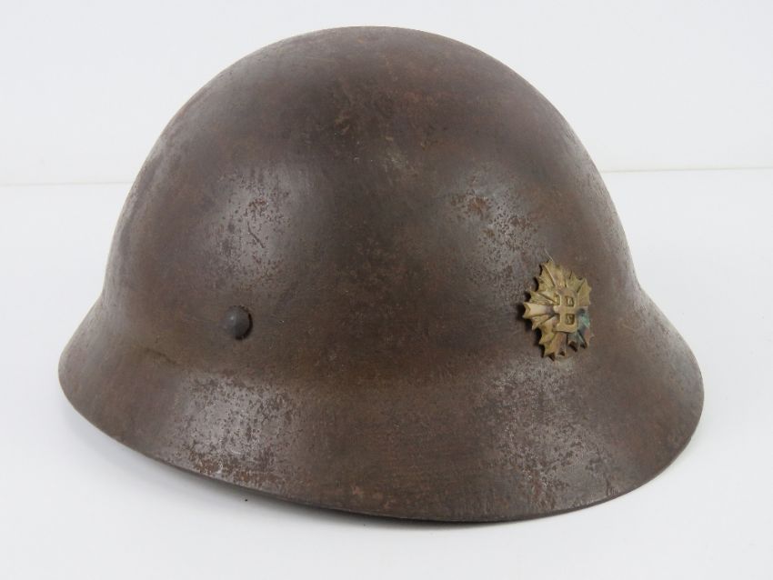 A rare WWII Japanese Police helmet with liner and chin strap. Japanese writing within.