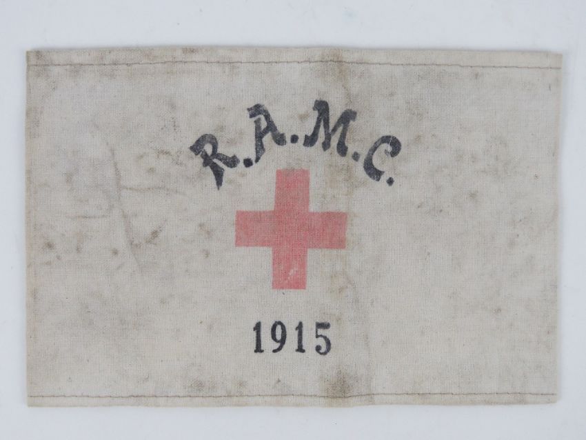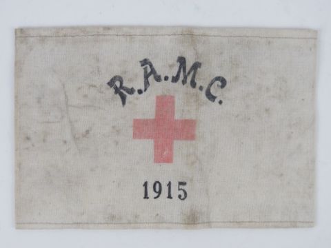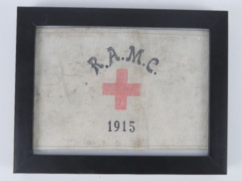 A WWI British R.A.M.C arm band dated 1915, in frame.