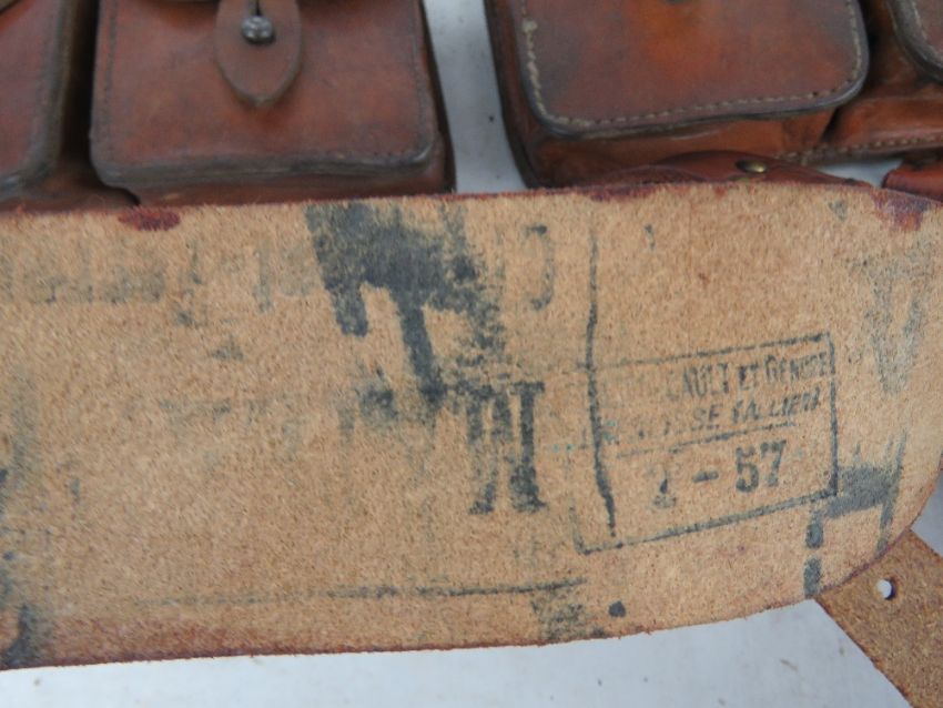 Three WWI French Lebel ammo pouches together with two Y straps and a belt.