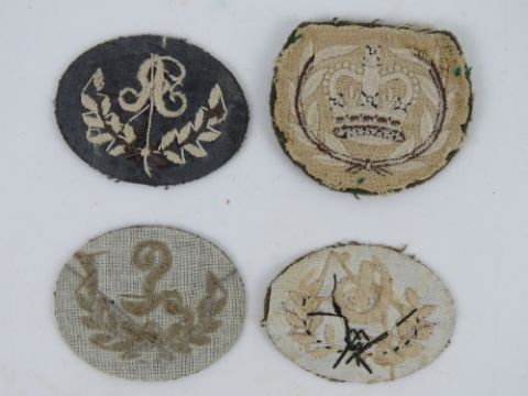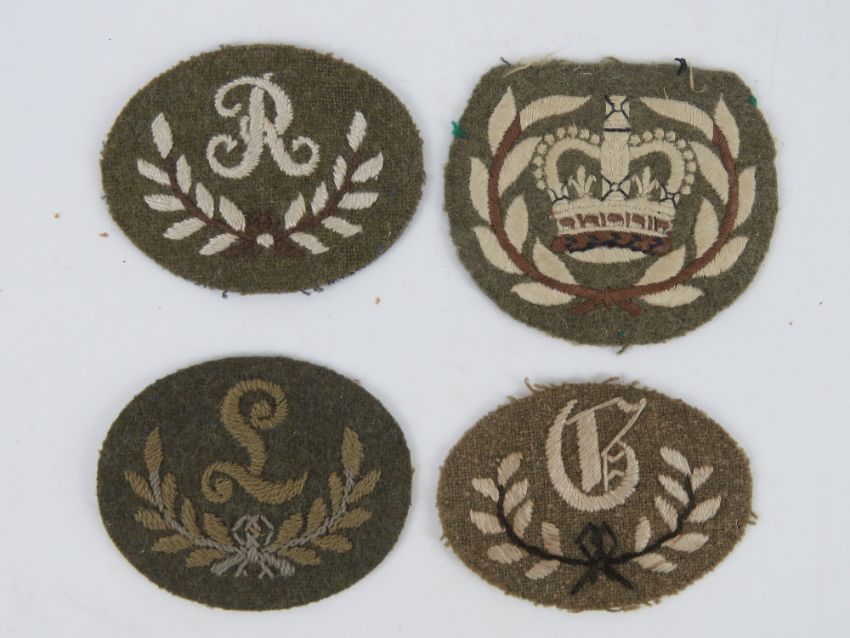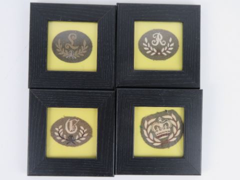 Four assorted WWII British cloth badges, in frames.