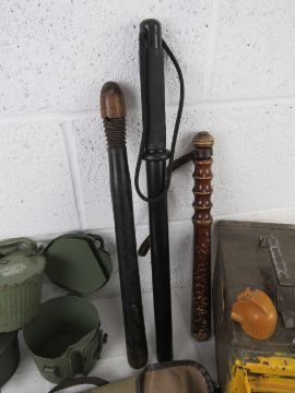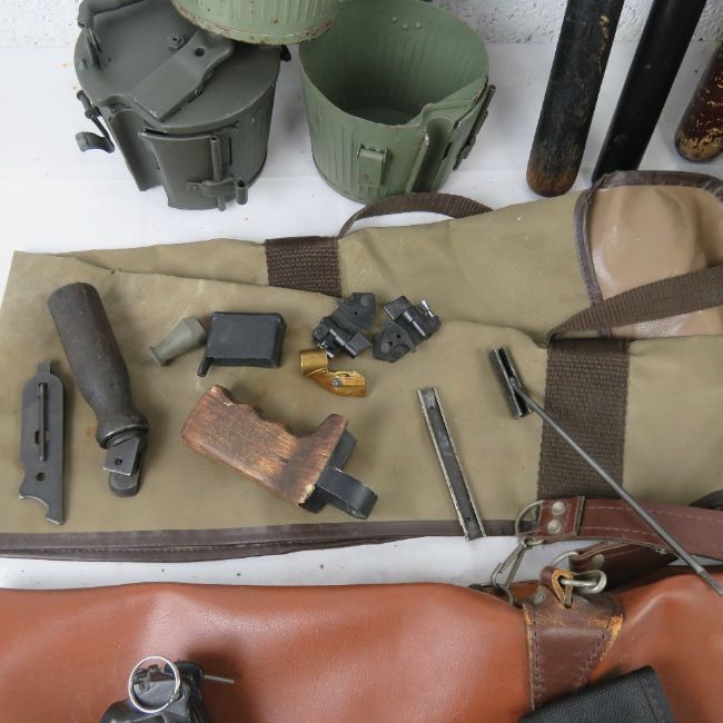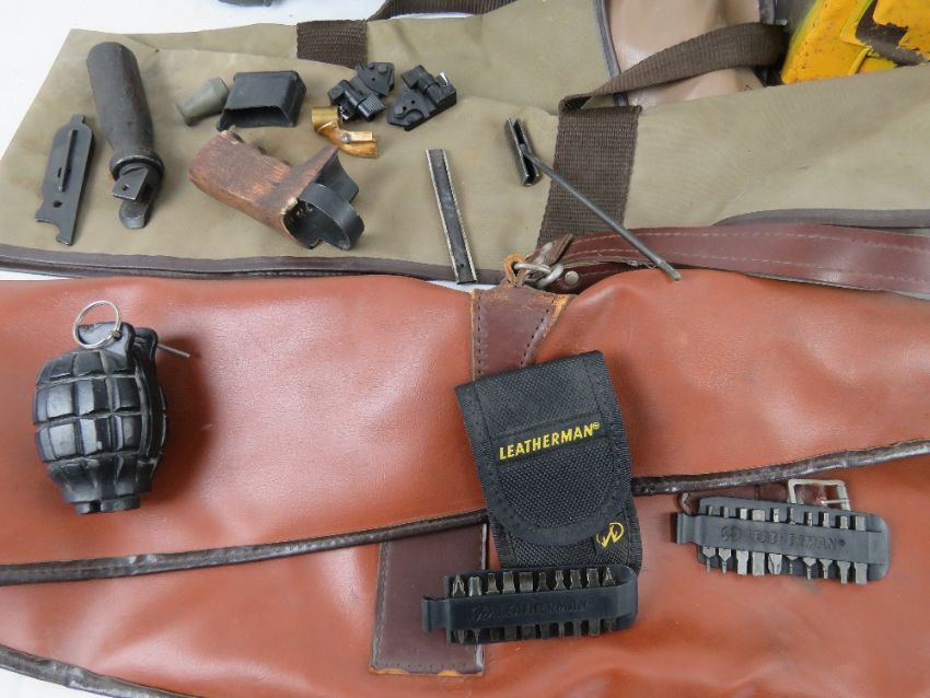 A quantity of miliatria including British Military Grenade box L2A2, 2 x gun cases, 3 x MG42 Drum magazines, grip handle, leather sling, 3 x police truncheons, Bren handle, Gerber, No.36 grenade, pouch of tools including screwdriver heads and alan keys heads + other bits as well. .