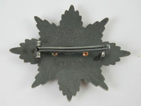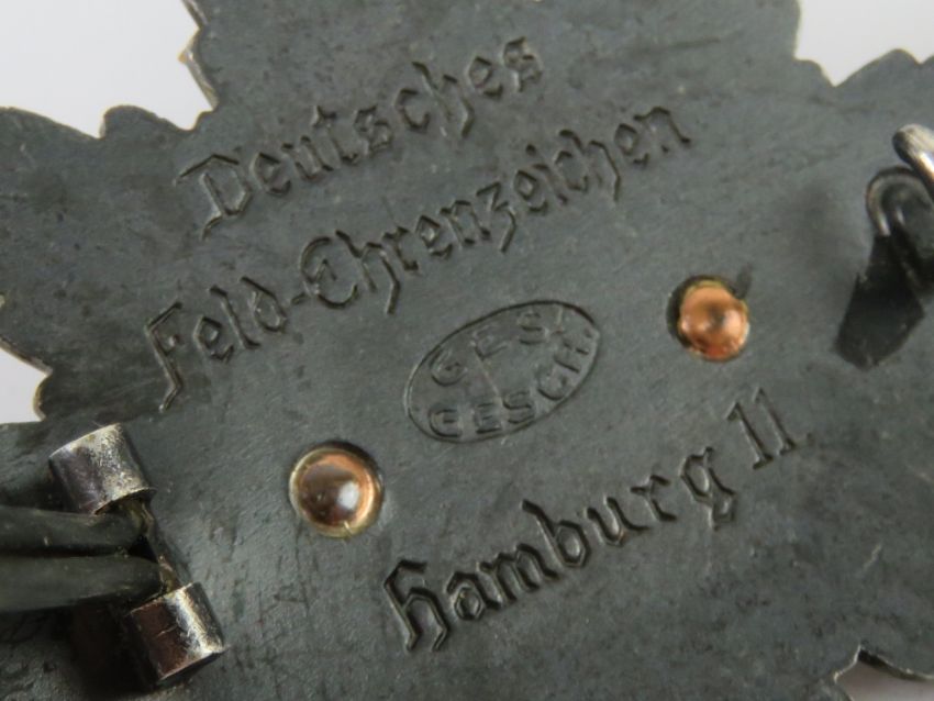 A WWI German Deutsches Feld-EhrenZeichen badge having white enamel cross to front, engraved to back hamburg 11 with Ges Gesch mark.