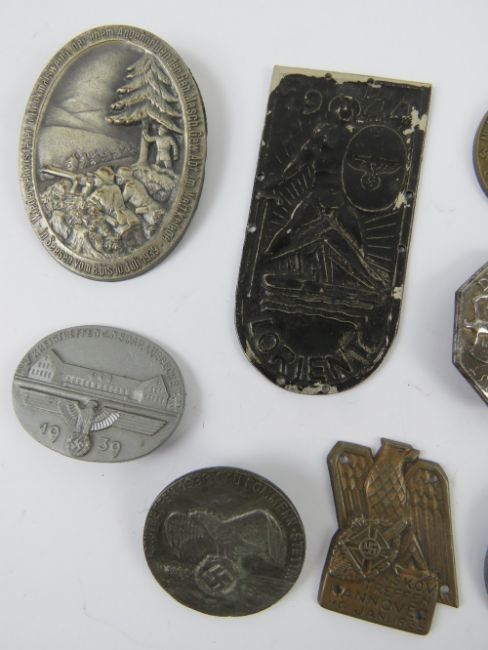 A quantity of assorted WWII German day badges, inc 1934 Deutsch 1st Die Saar 1934, Gautreffen 1938, N.S.K.O.V Treffen 1935, 1939 NSDAP, etc. Ten items.