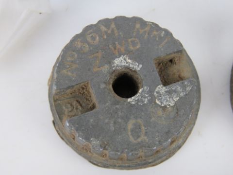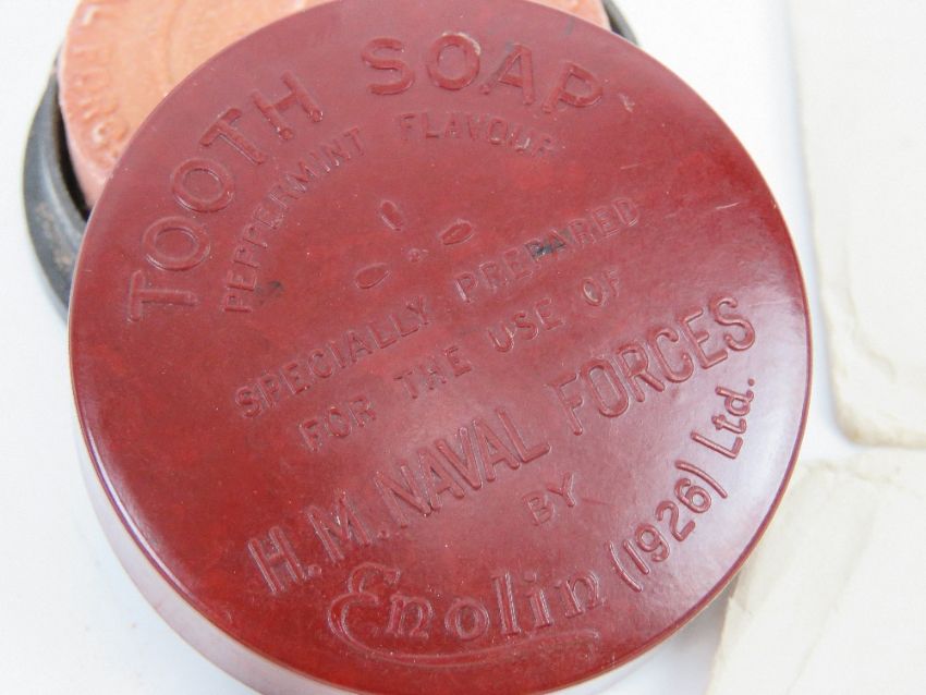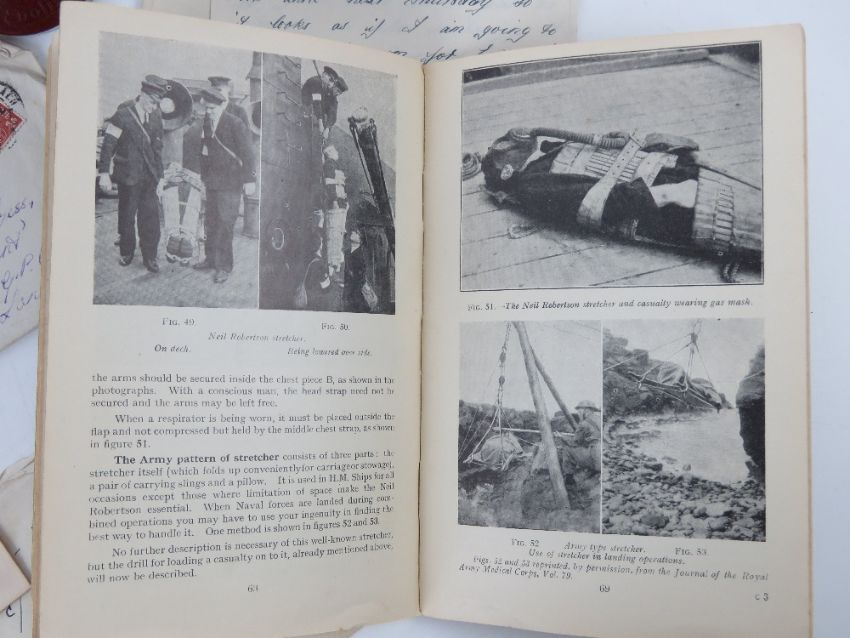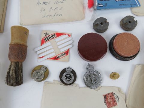 A quantity of Royal Navy ephemera including; first aid book dated 1943, tooth soap, shaving brush, a quantity of cWWII letters, No.36 grenade bases, button and cap badges.