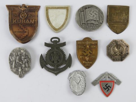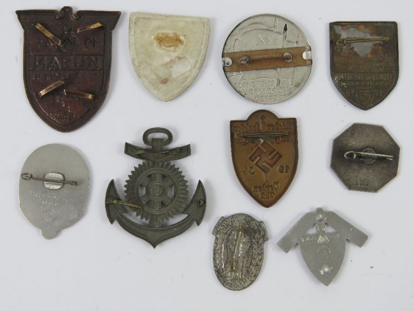 A quantity of assorted WWII German day badges including; 1938 Nordmark- Treffen, 1935 Tag Der Arbeit, 1943 Kuban, etc. Ten items.