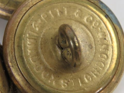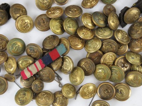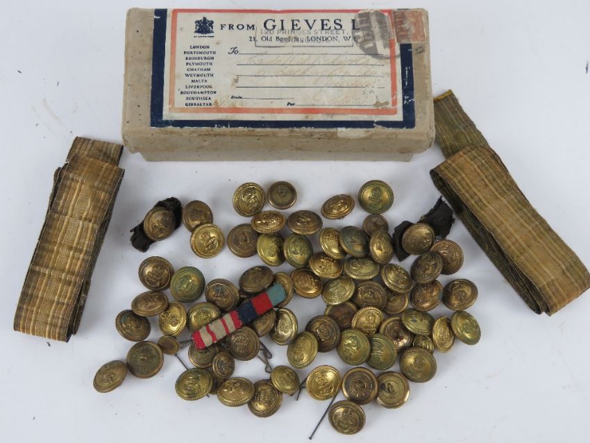 A quantity of gold braids Navy brass buttons and medal ribbons contained within a Gieves box having stamps and address upon.