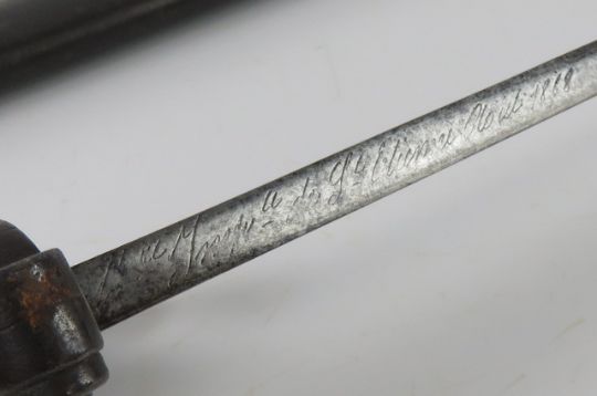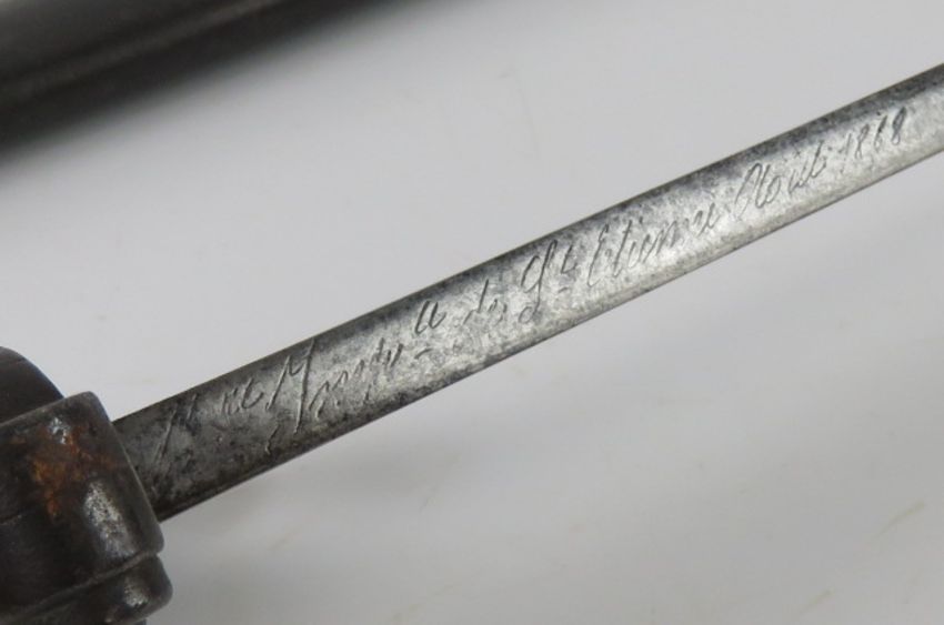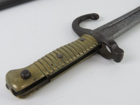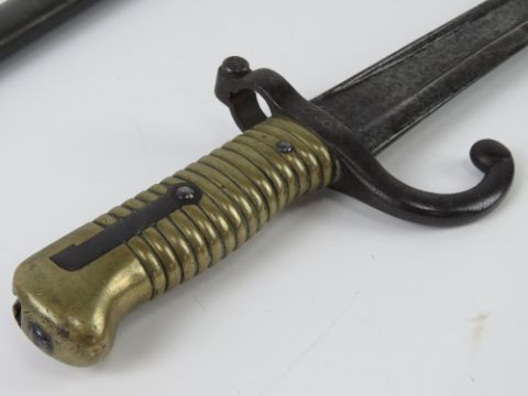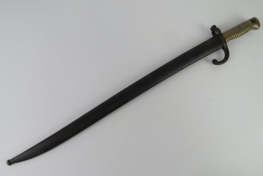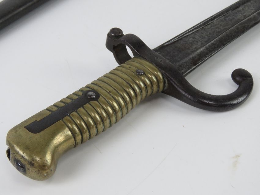 A French M1868 Chassepot Yataghan bayonet St Etienne 1868, engraved blade edge, brass grip, hook quillion, 56.5cm blade length, with scabbard.
